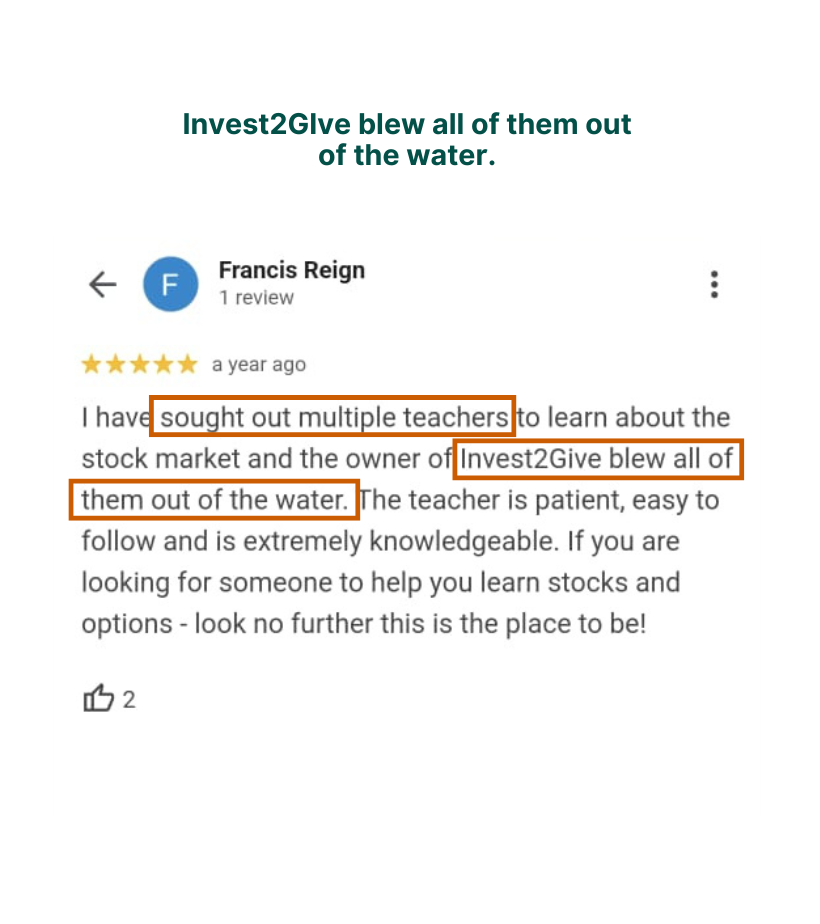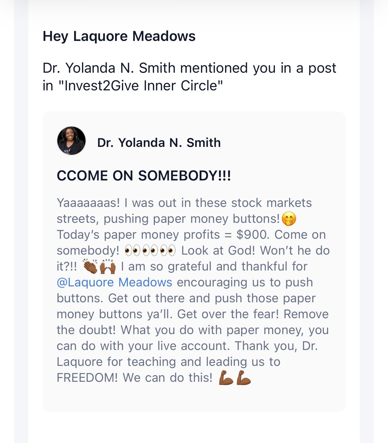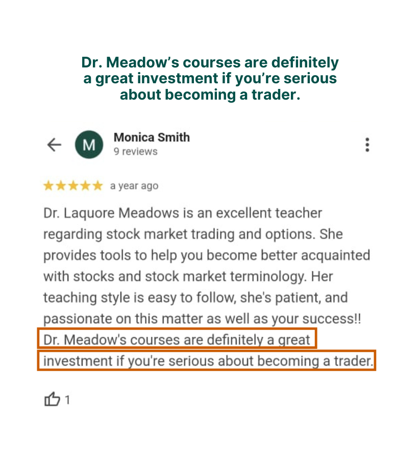 Disclaimer: There is a high degree of risk involved in investments and trading. Investments are NOT FDIC Insured are NOT Bank Guaranteed and may lose principal. Past performance is not indicative of future results; profits are not guaranteed. Invest2Give, LLC, its affiliates and Laquore Meadows do not in any form endorse investing or trading with funds that course participants cannot afford to lose. Laquore Meadows is NOT a financial advisor and nothing she says is meant to be a recommendation to buy or sell any financial instrument. Invest2Give, LLC or Laquore Meadows will NEVER ask you to send money to trade for you or to provide any services associated with cryptocurrency. Please report any suspicious emails or fake social media profiles claiming to represent Invest2Give or Laquore Meadows. There are no guarantees or certainties in trading or investing. Investment courses taught by or on behalf of Invest2Give, LLC are offered for educational purposes only and should NOT be considered investment, legal or tax advice. The information provided is for entertainment and general educational purposes only, and is not intended to substituted for or misconstrued as advice from an investment, legal and/or tax advisors. You should not treat any opinion expressed by Laquore Meadows or as a specific inducement to make a particular investment or follow a particular strategy, but only as an expression of Laquore Meadows opinion and the opinions Invest2Give LLC and its affiliates. If you have any doubts as to the merits of an investment, you should seek advice from an independent financial advisor. Please be advised that links to third-party financial resources are provided as a convenience and for informational purposes only. Invest2Give, LLC and Laquore Meadows do not endorse or approve the products, services and/or opinions of the entities or individuals associated with these links. We will not be responsible for any errors or omissions on the site including in articles or postings, for hyperlinks embedded in messages, or for any results obtained from the use of such information. Nor, will we be liable for any loss or damage, including consequential damages, if any, caused by a reader’s reliance on any information obtained through the use of our Services. Invest2Give, LLC., Laquore Meadows and/or any third-party affiliates bear no responsibility for the accuracy, legality or content of any external site and any subsequent links. Invest2Give, LLC and Laquore Meadows are not liable for individual investment decisions and do not hold any liability for loss or damages resulting from participation in this course, the utilization of materials included, and/or individual investment or trading decisions. By enrolling in any course offered by Invest2Give, LLC or Laquore Meadows you acknowledge, understand, and agree to the terms and conditions outlined herein.